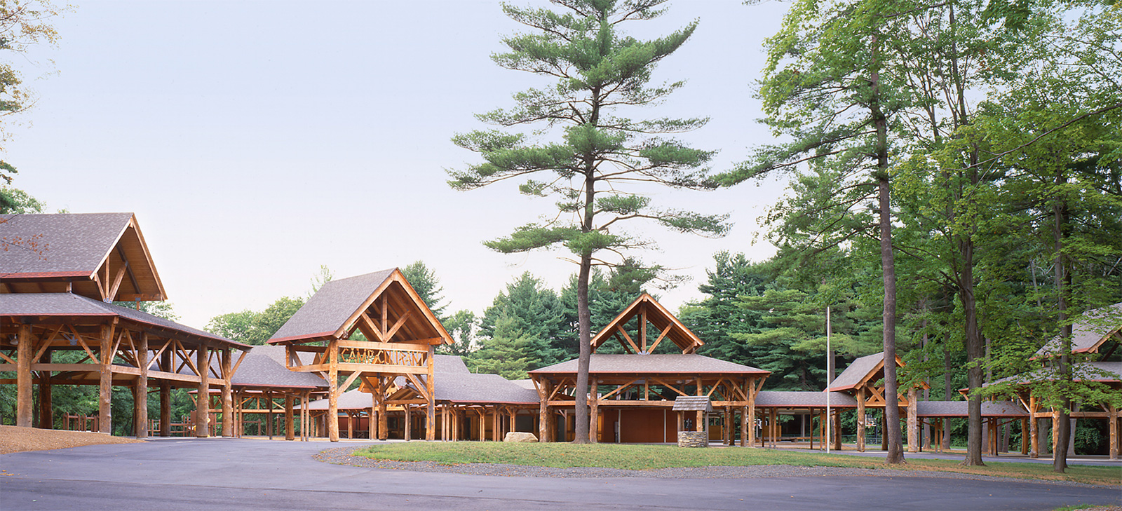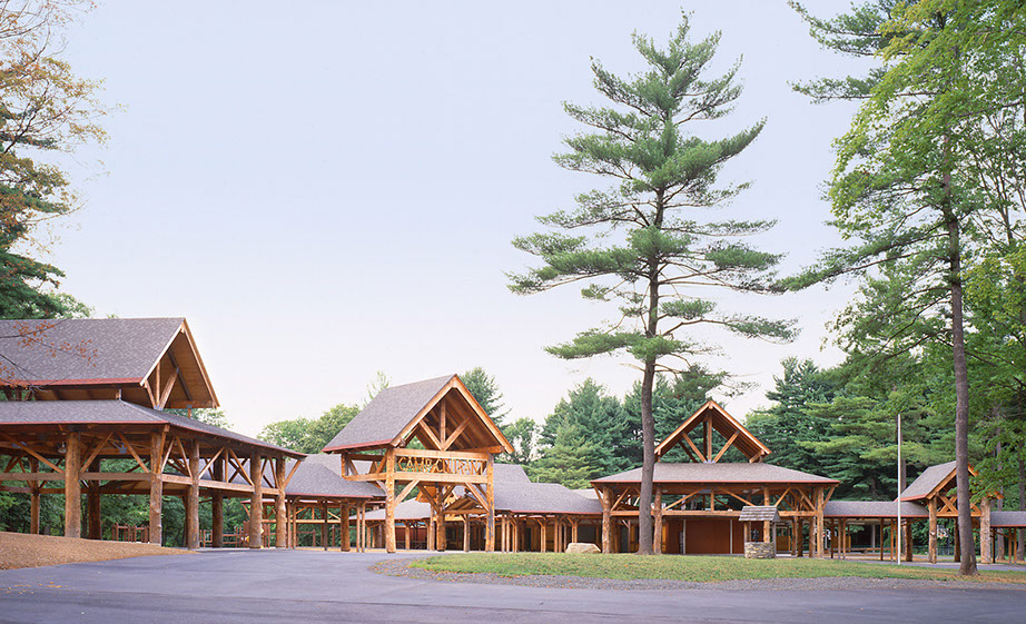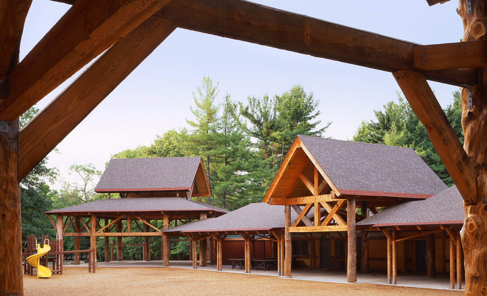 New post and beam pavilions were added to allow the camp to operate in all weather conditions, providing shade on hot, sunny days and shelter during rainstorms. The timbers were harvested from the site, and the new pavilions blend into the backdrop of white pine and mature oak trees.