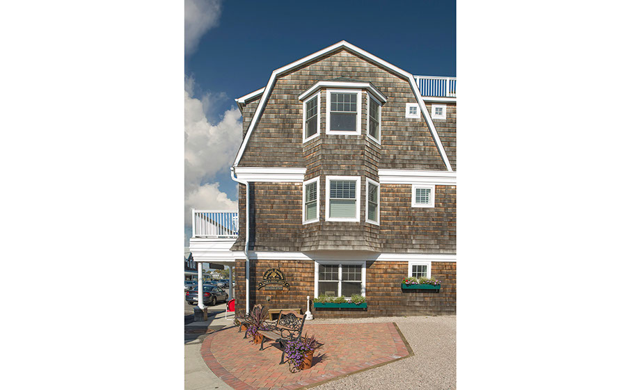 The condominium takes advantage of the slope of the hill to meet stringent zoning requirements and blend with the context of beautiful seaside cottages. The two main buildings house the two-story units, plus basement and garages at the lower level. Private elevators in each townhouse connect the three levels.