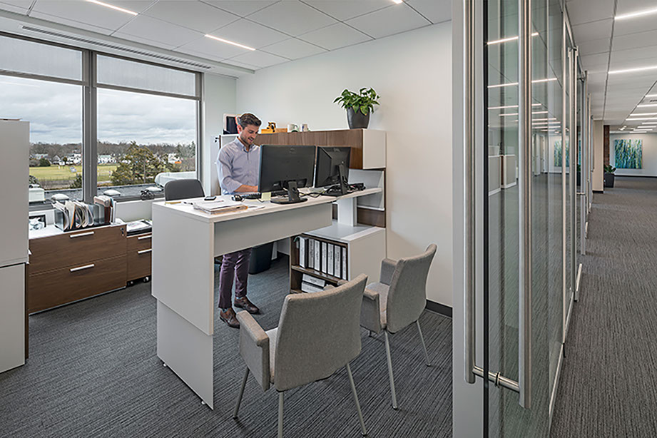 After relocating to Blue Back Square in West Hartford, Penwood Real Estate was interested in updating their office to fit their new surroundings. Tecton was tasked with providing design services with the goal of building upon the company’s forward-thinking mindset through the creation of a vibrant, cool environment for current staff, young professionals and potential new hires to thrive in. The newly renovated space excites and energizes with bright, daylight saturated spaces where one can work in the comfort of their own space, pop into a private conference room or work collaboratively in the kitchen/open lounge media space, all with technology right at their fingertips.