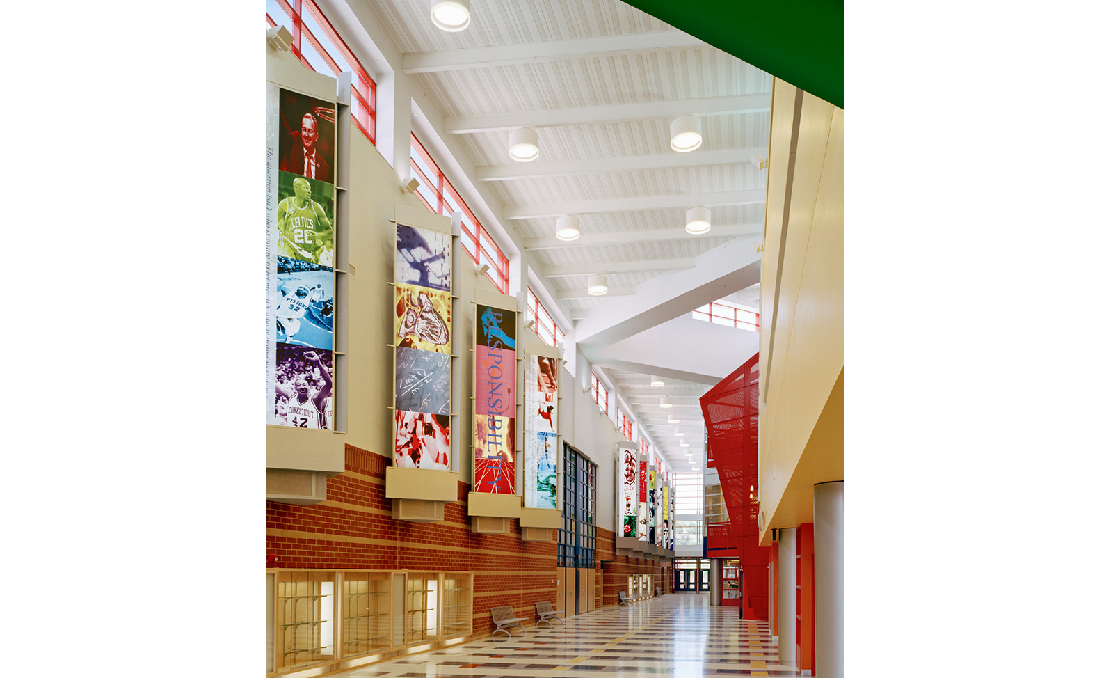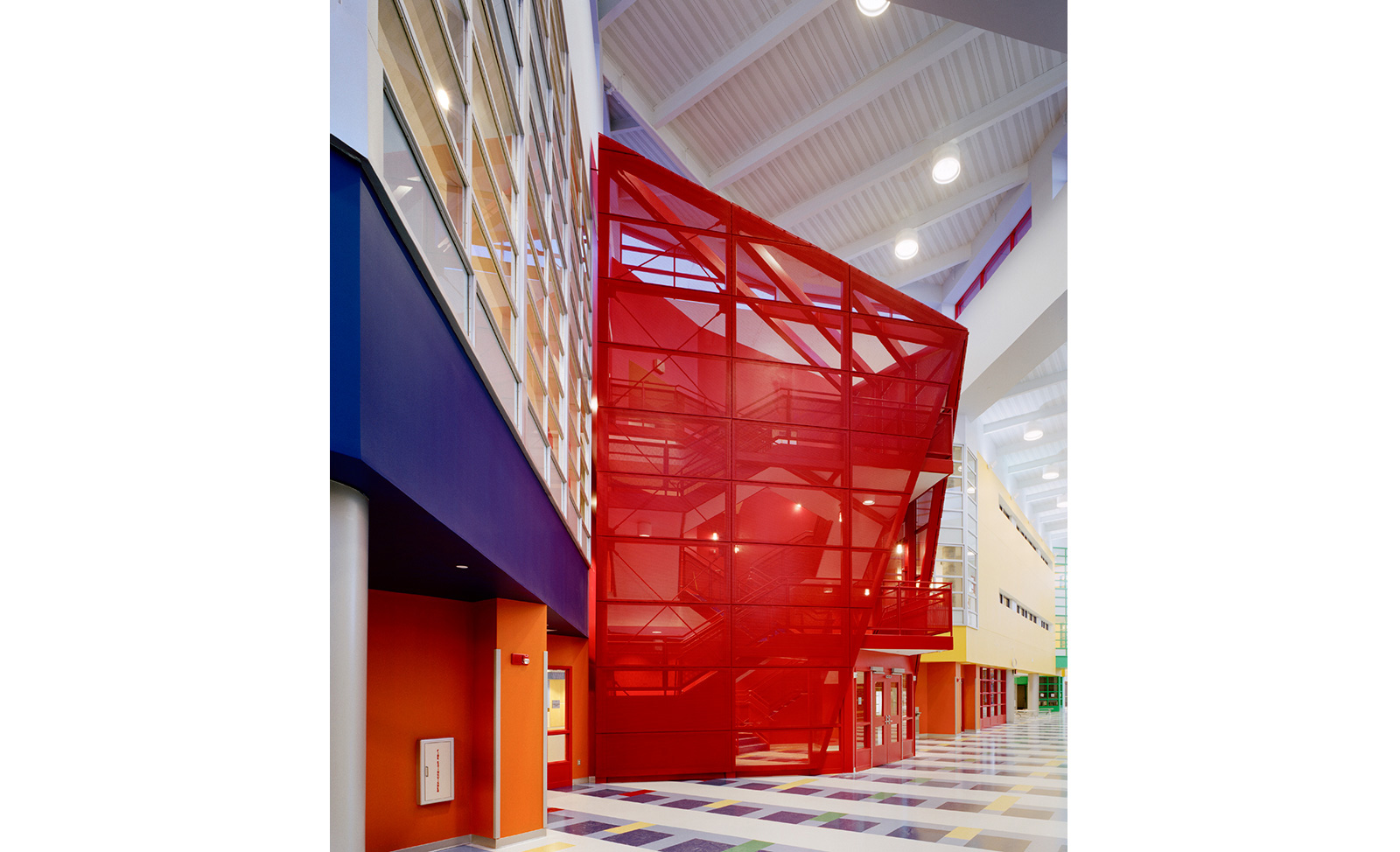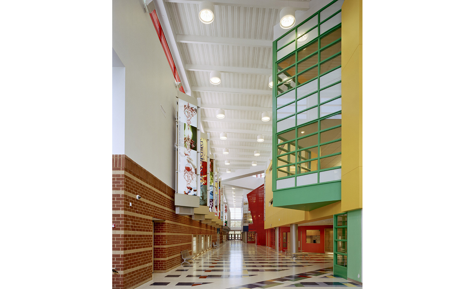 The 158,000 SF gross area required to support the program requirements limited site selection, and necessitated nearby road closures surrounding the chosen triangular brownfield site. The intent of the school was to build two schools in one building to accommodate the nearly 500 high school students and 250 middle school students. Tecton’s design created the required physical separation, while enabling shared spaces like the library and lunchroom. All spaces were united by bold colors and design features that echo the energy of the school and the students.