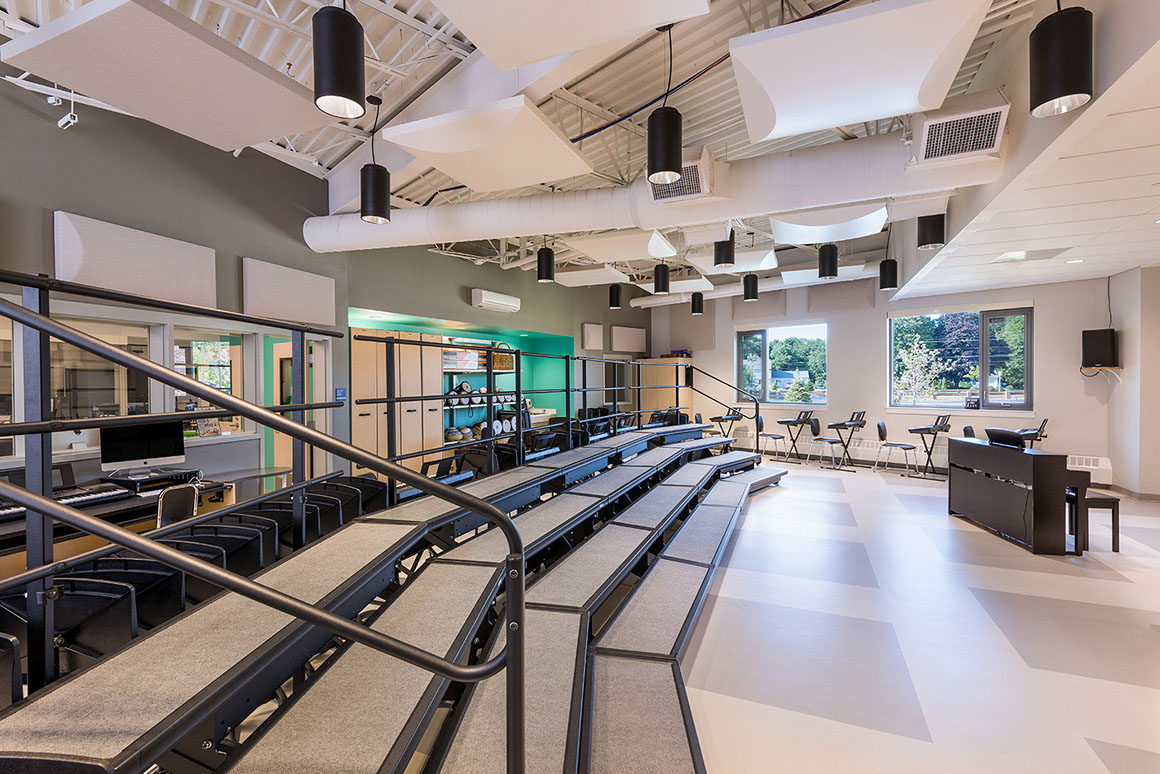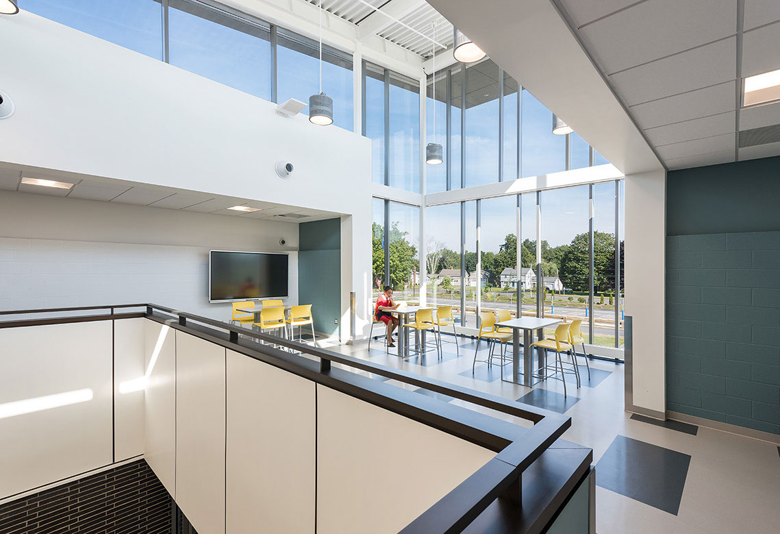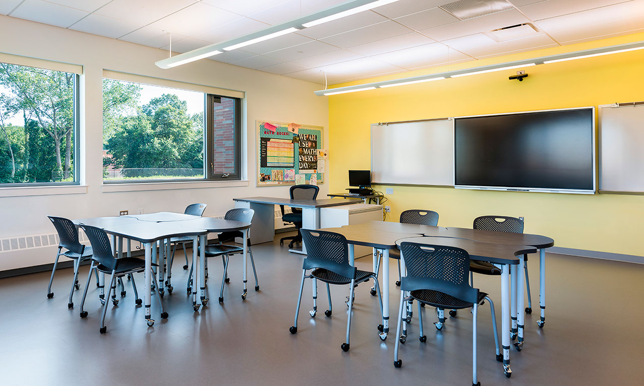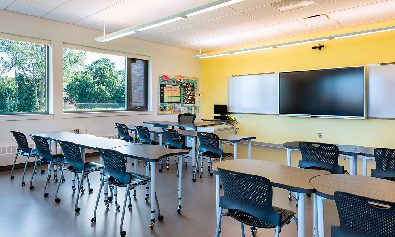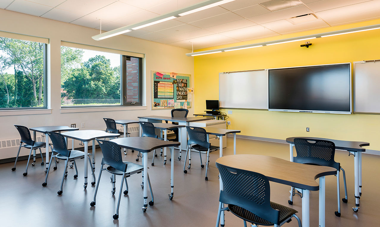 new a school since 2013, seeing the project through two studies and a successful budget referendum. Our design retains an existing wing and gymnasium, adds a new two-story wing, and demolishes the more aged facilities. This efficient layout is conducive to the current team teaching model, adds additional parking, greatly improves traffic patterns and makes better use of exterior space for playing fields. Additionally, the project allows an opportunity to upgrade the aged building to today’s IT, ADA, code and safety and security standards.